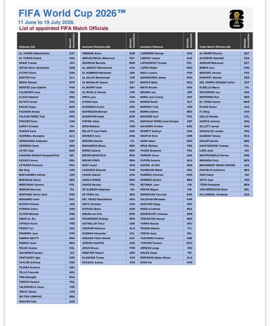 La FIFA a rendu publique la liste des 52 arbitres retenus pour la Coupe du monde 2026.